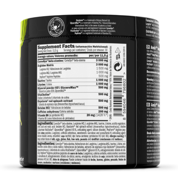 Ingredientes: CarnoSyn® beta-alanina, hidrocloruro de L-arginina, L-arginina AKG, taurina, L-lisina,acidulantes: ácido cítrico y ácido málico; hidrocloruro de betaína, extracto de espinaca roja Oxystorm® (Amaranthus hypochondriacus), L-bitartrato de colina VitaCholine®, GlyceroMax® (glicerol 65 %, antiaglomerante: dióxido de silicio), PepForm® Arginina péptidos (péptidos de suero de leche, L-arginina), cafeína anhidra, edulcorantes: sucralosa y acesulfamo-K; antiaglomerante: dióxido de silicio; aroma, emulgente: lecitina de soja; colorante: beta--caroteno; piridoxina HCl (vit. B6)